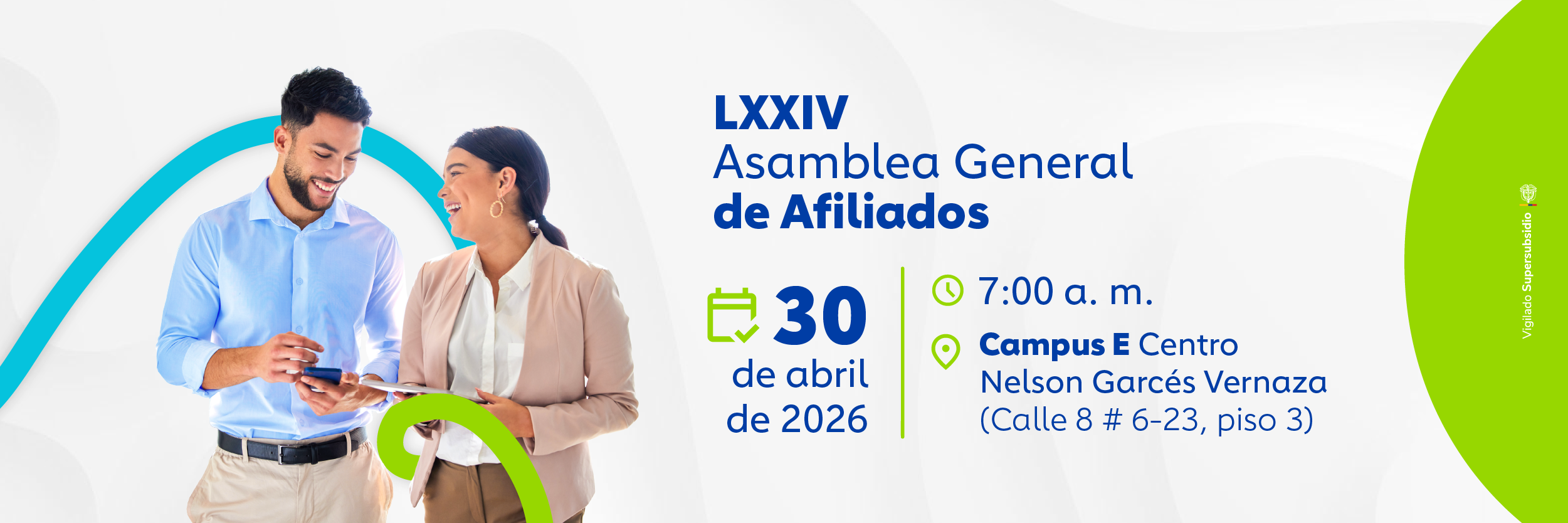 Convocan a los afiliados a esta corporación a la reunión de la LXXIV Asamblea General Ordinaria de Afiliados, la cual se llevará a cabo el próximo jueves 30 de abril de 2026, a las 7:00 am. Deberá presentarse en el piso 3 del Campus E Centro Nelson Garcés Vernaza de Comfandi, localizado en la calle 8 No. 6-23 de la ciudad de Santiago de Cali.